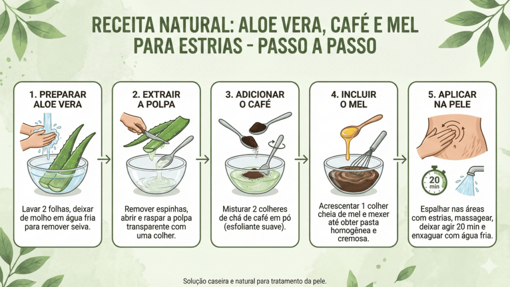 As estrias resultam do rompimento de fibras por estiramento rápido. A receita caseira une polpa de aloe vera, 2 colheres de café e 1 de mel. A mistura age por 20 minutos, promovendo esfoliação e hidratação local.
