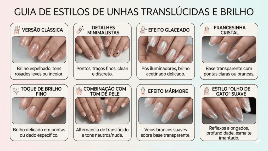 Dentro dessa tendência surgiram várias versões personalizadas para quem quer adaptar o visual sem perder a base translúcida. Assim, você consegue variar o estilo mantendo o mesmo clima de leveza e sofisticação.