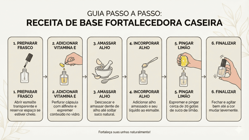 Fortalecer unhas fracas em casa é possível com esmalte caseiro: mistura de esmalte transparente, alho, limão e vitamina E cria proteção, hidrata e reduz quebra e descamação.