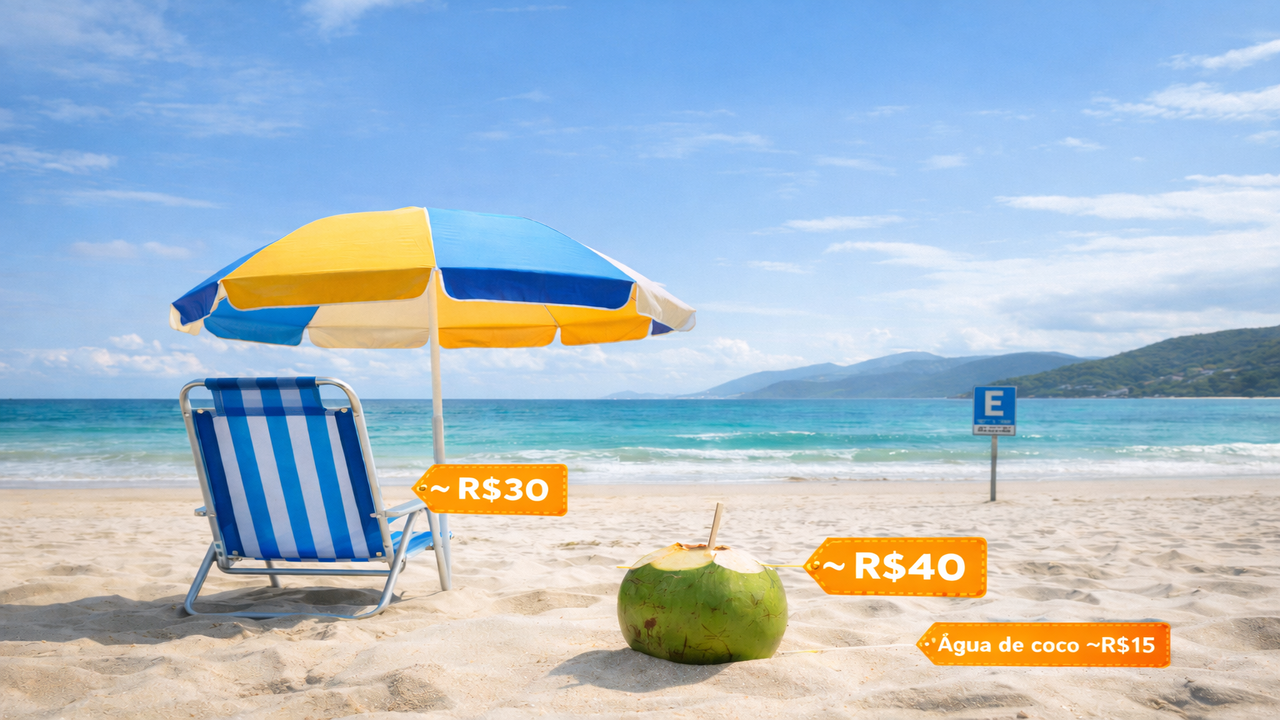 | Médio | Aluga cadeira, estacionamento dividido, “Prato Manezinho”, 2 bebidas. | R$ 150 – R$ 200 |