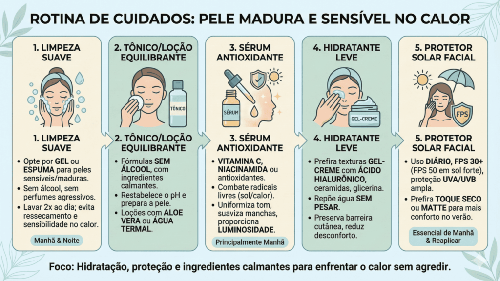 A pele madura sofre mais no calor por perda de colágeno, sensibilidade e variação de oleosidade. Rotina leve com limpeza suave, antioxidantes, hidratação em gel, protetor solar e hábitos diários reduz manchas, desconforto e vermelhidão.