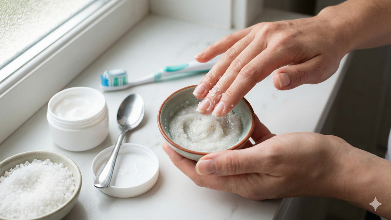 A mistura caseira leva apenas sal e hidratante. O sal atua como esfoliante mecânico, removendo pelinhas soltas e asperezas, enquanto o hidratante repõe água e lipídios, suavizando a pele e protegendo as cutículas, que são a barreira natural da unha contra agressões externas.