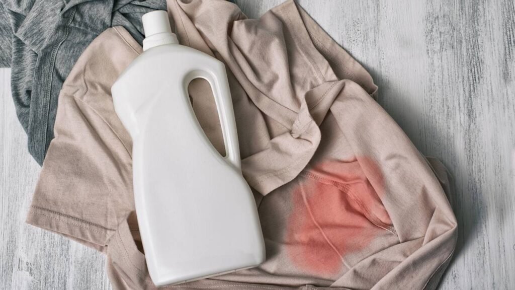 A chamada “mancha” de água sanitária não é uma sujeira depositada sobre o tecido, mas uma descoloração permanente. O produto oxida os pigmentos responsáveis pela cor, deixando a região mais clara ou em tonalidades diferentes, como alaranjado ou amarelado, principalmente em roupas escuras.