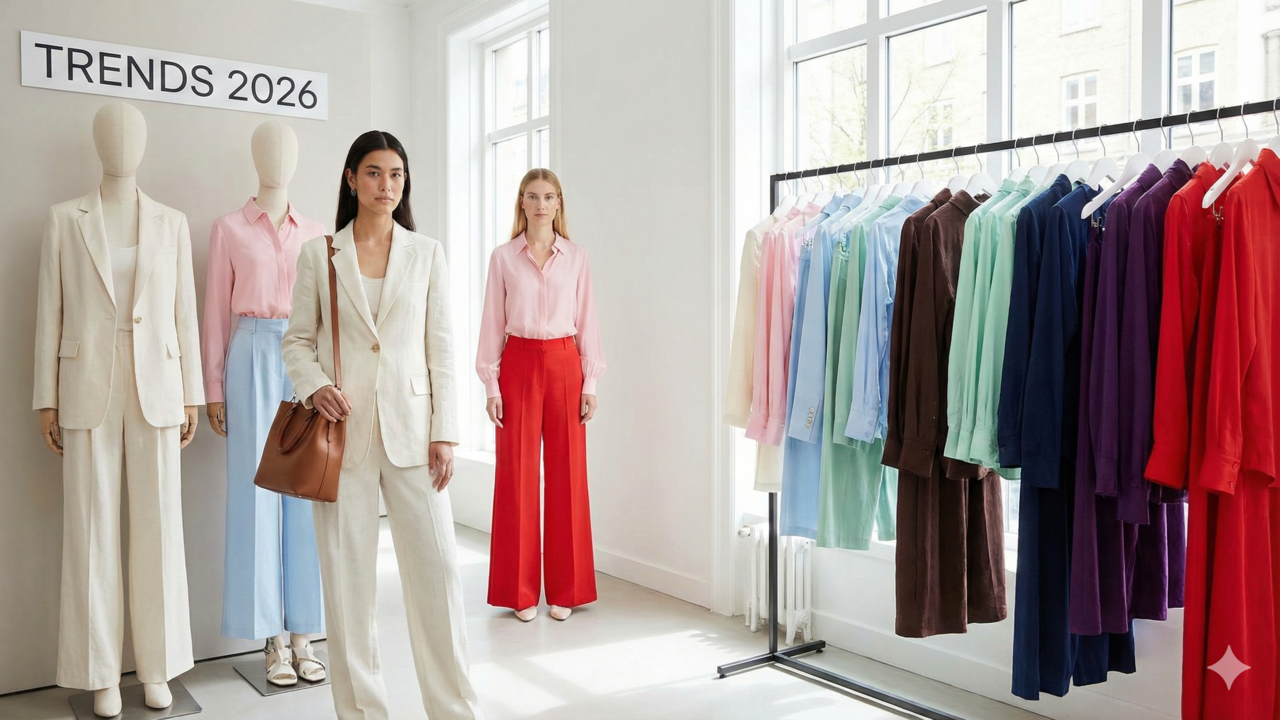Consultorias de tendências e marcas globais indicam oito tonalidades principais: off-white, rosa pastel, roxo, azul bebê, verde-menta, marrom, azul marinho e vermelho em versões vibrantes e fechadas. Juntas, essas cores criam uma paleta flexível, que circula bem entre ambiente profissional, vida urbana e ocasiões especiais.