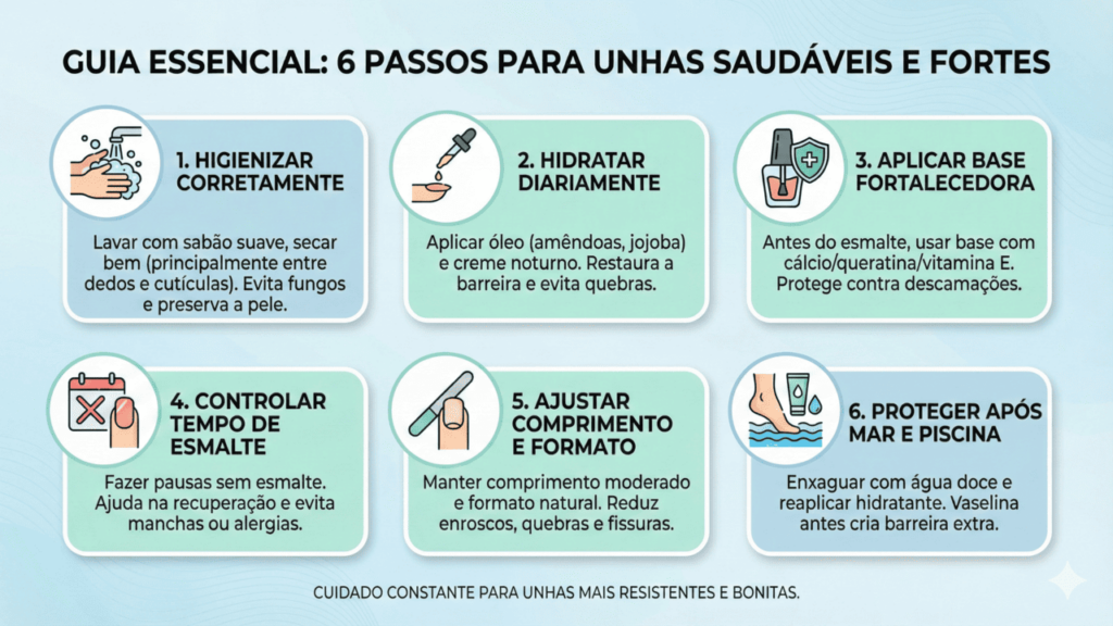 Alguns cuidados simples, feitos com regularidade, já fazem muita diferença na aparência e na resistência das unhas. A ideia é combinar higiene, hidratação e uso consciente de esmaltes, respeitando o ritmo natural de crescimento. Assim, você reduz o desgaste causado pelo calor, pela água e pelos atritos do dia a dia.