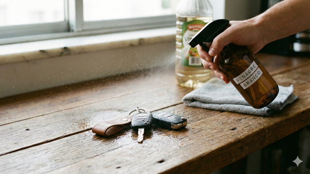 A expressão-chave aqui é vinagre nas chaves do carro. O vinagre branco destilado contém ácido acético em concentração moderada, ajudando a soltar gordura, manchas superficiais e pequenas incrustações que aderem ao metal ao longo do uso diário.