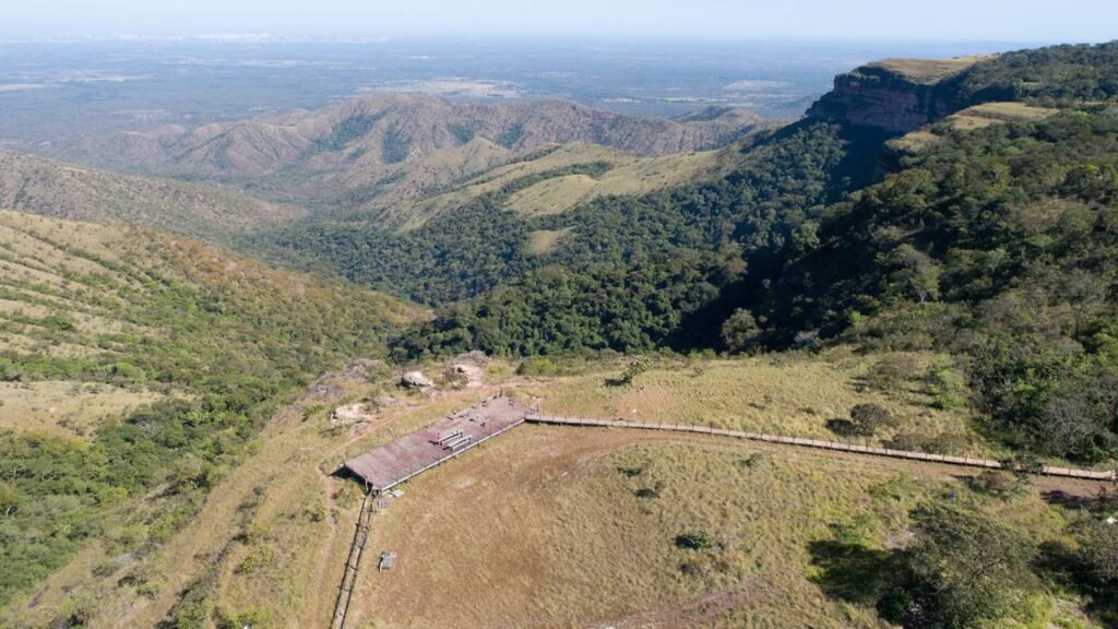 Neste mirante, você tem uma vista incrível para a planície pantaneira e, em dias de céu limpo, dá até para ver as luzes da cidade de Cuiabá brilhando longe no horizonte.