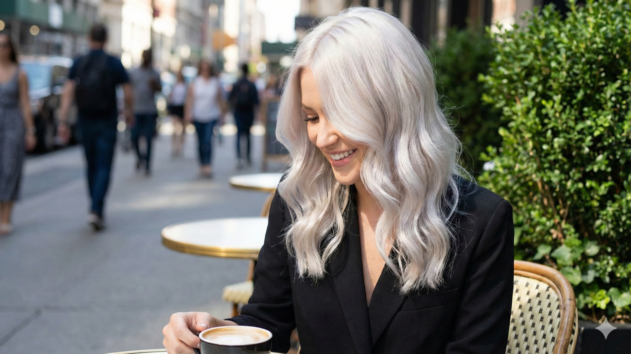 O cabelo loiro platinado se destaca pelo tom muito claro e frio, que se aproxima do branco, gelo ou cinza perolado, evitando reflexos intensamente amarelos. Diferente dos loiros dourados, privilegia nuances acinzentadas, pérola ou levemente prateadas para criar um visual luminoso, porém sem o brilho amarelado típico.