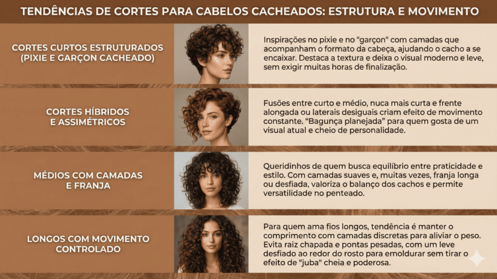 Em 2026 os cachos ganham liberdade com cortes em camadas pixies e franjas O visagismo ajuda a equilibrar o volume e o formato do rosto A manutenção trimestral e a finalização correta garantem fios saudáveis e definidos