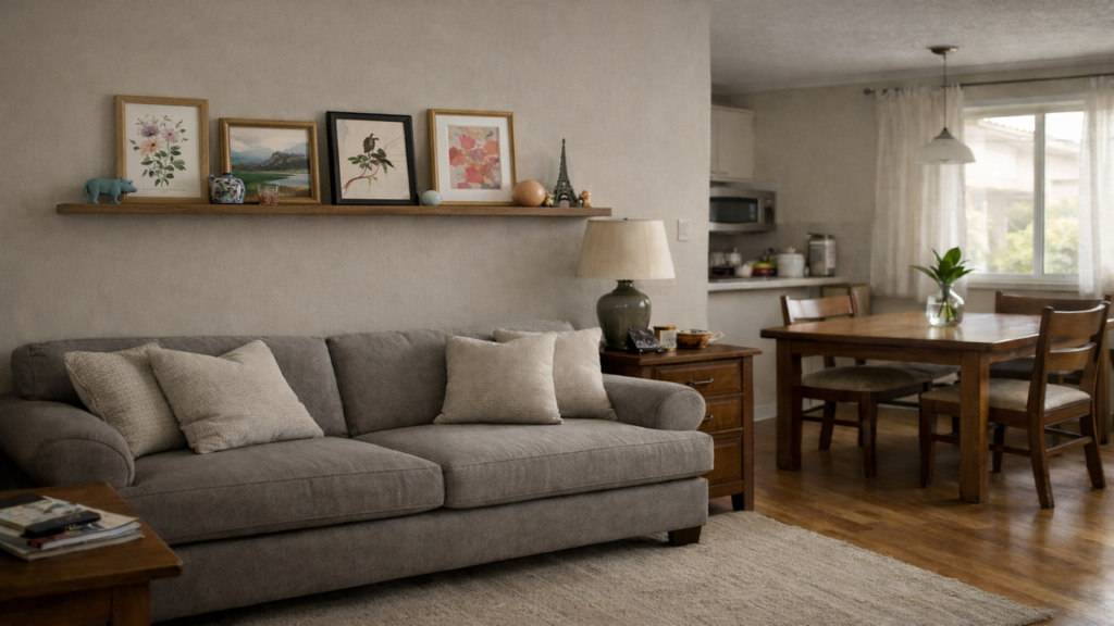 A decoração de sala simples mostra que é possível unir funcionalidade e memória afetiva no mesmo espaço. Fotografias de família, imagens religiosas, lembranças de viagens e objetos de uso cotidiano podem conviver de forma equilibrada, desde que agrupados em estantes, nichos ou prateleiras para evitar poluição visual.