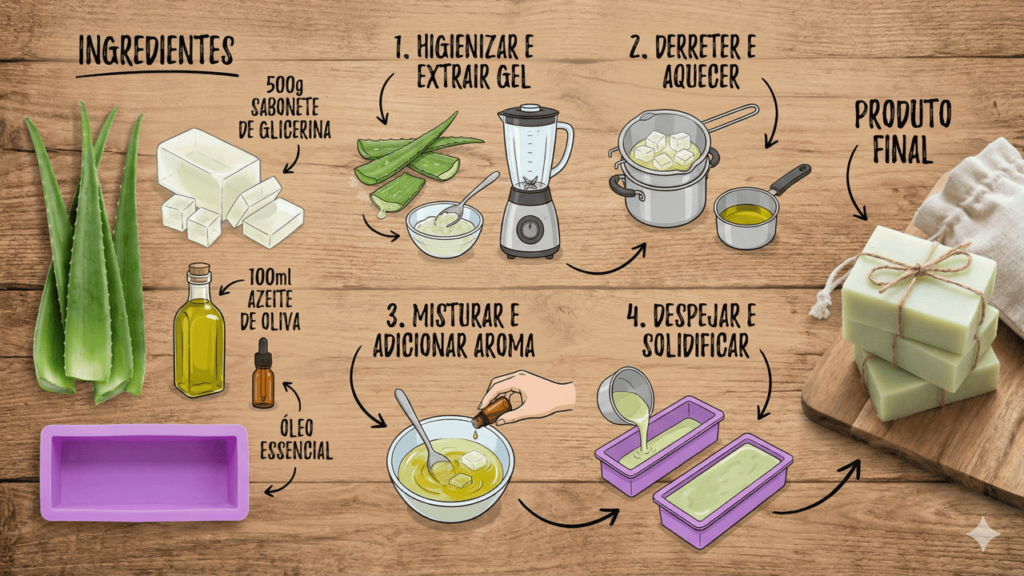 O processo de preparo pode ser organizado em etapas simples, que ajudam a manter tudo mais prático e seguro, mesmo para quem nunca fez um sabonete artesanal antes. Seguir essas etapas com calma contribui para um resultado mais uniforme, com melhor textura e aproveitamento das propriedades da aloe vera, além de facilitar a higienização correta dos materiais.
