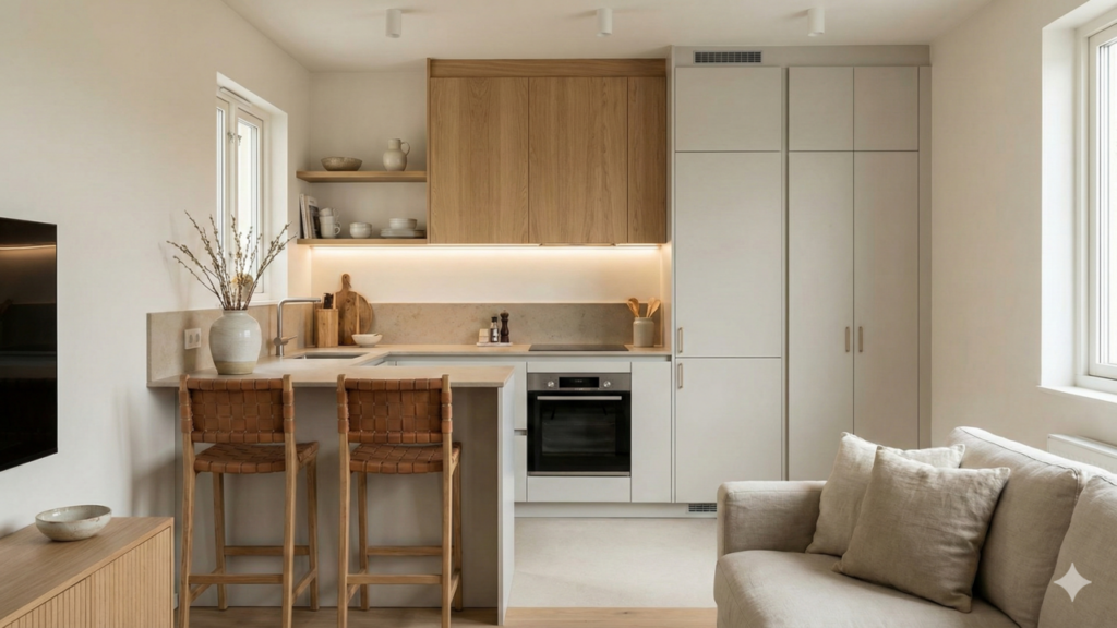 Na paleta de cores, seguem em alta tons neutros e suaves, como branco levemente aquecido, areia, cinza claro e variações de bege e terracota discreta, que ampliam visualmente cozinhas pequenas. Esses tons servem de pano de fundo para objetos coloridos, que podem ser trocados ao longo do tempo conforme o morador muda de estilo.
