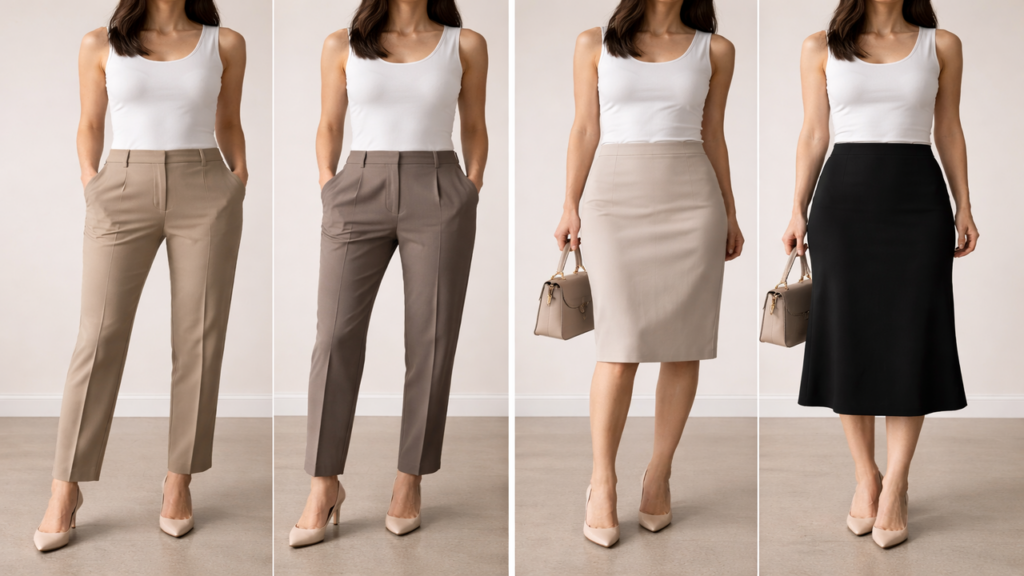 Calças retas, cenoura suave ou levemente afuniladas mantêm a linha vertical, especialmente com barras na altura do ossinho do tornozelo ou levemente alongadas. Nas saias, comprimentos logo abaixo do joelho ou na parte mais fina da panturrilha costumam alongar mais do que os que param na região mais larga da perna.