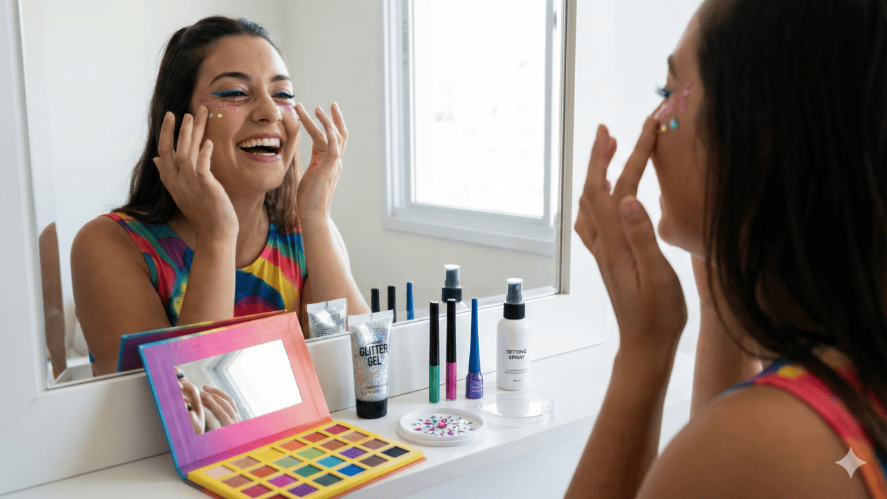 A maquiagem de carnaval em 2026 foca em praticidade: use sombras vibrantes aplicadas com os dedos, pedrarias adesivas e fixadores potentes. Aposte em produtos multifuncionais e glitter biodegradável para um visual alegre e resistente.