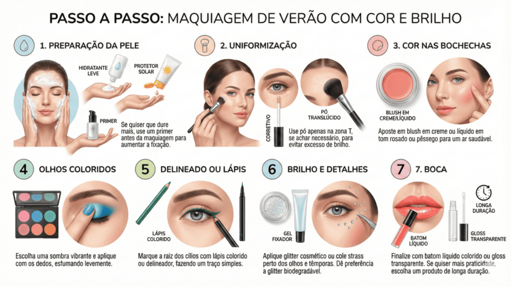 Se a ideia é algo rápido e sem complicação, dá para seguir um roteiro básico: pele leve, olhos coloridos, um toque de brilho e boca confortável. A partir disso, você adapta de acordo com o tempo disponível, o humor e o que tiver em casa, deixando tudo mais prático.