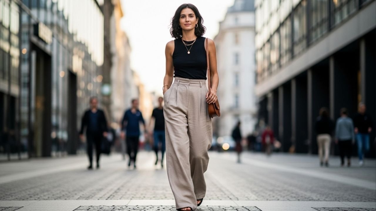 A moda utiliza princípios de percepção visual para equilibrar proporções do corpo. No caso da wide leg, o segredo está em criar uma linha vertical longa, especialmente quando combinada com cintura alta e barra próxima ao chão, como você vê a seguir.