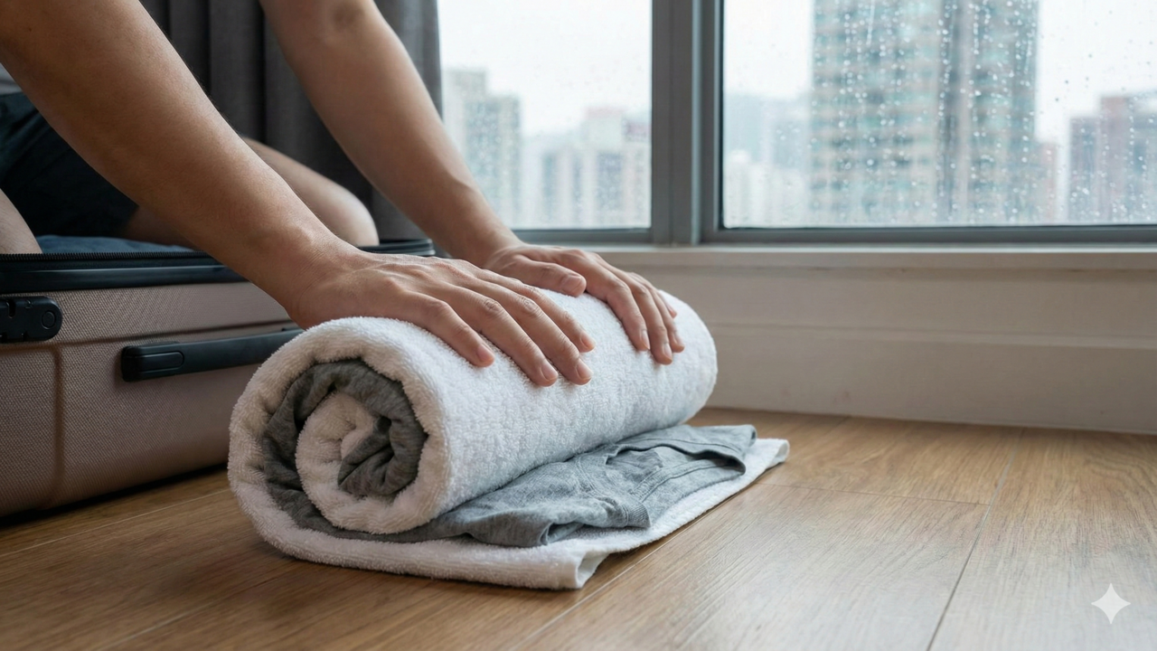 - Enrolar em formato de cilindro: dobrar a toalha sobre a roupa e ir enrolando até formar um rolo compacto, com a peça por dentro.