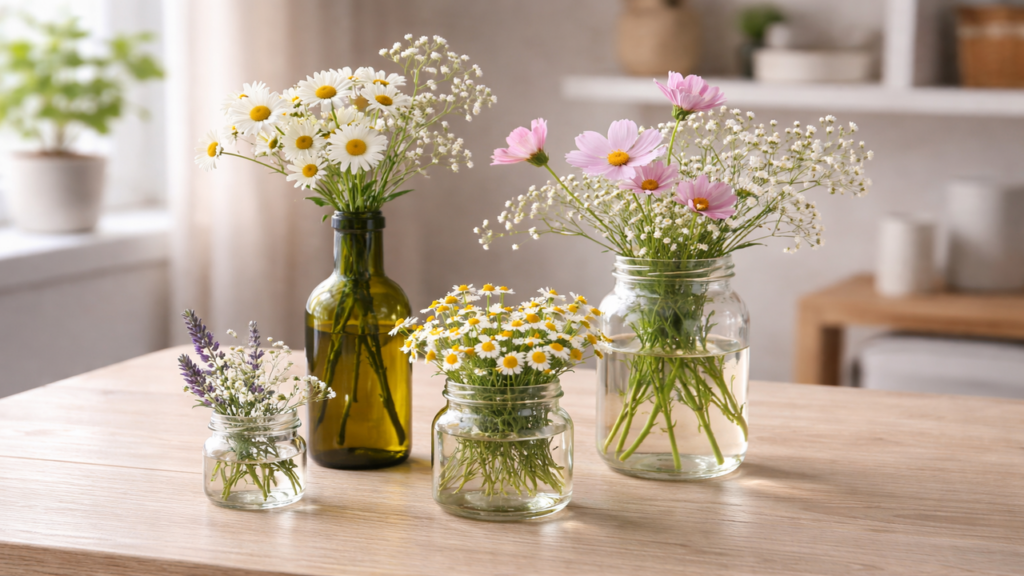 Transformar garrafas e frascos em vasos alternativos é simples e acessível, exigindo basicamente uma boa higienização e a remoção de rótulos e adesivos. Garrafas altas podem receber flores de hastes longas, enquanto potes menores funcionam bem com flores secas ou arranjos compactos, permitindo montar composições variadas sem peças caras.
