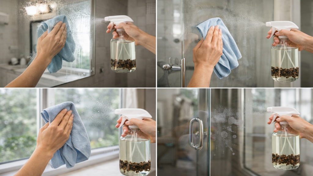 Esse método funciona bem em janelas, espelhos de banheiro, portas de vidro e box. Em áreas com acúmulo de gordura de sabonete ou marcas de água, pode ser útil repetir a aplicação, sempre sem necessidade de esfregar com força excessiva.