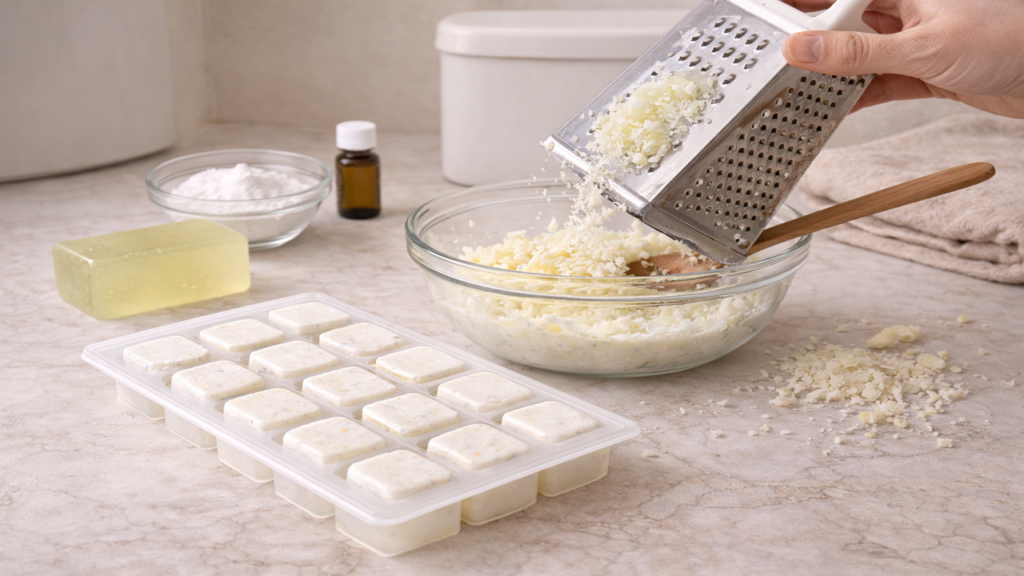O processo começa com o ralamento completo do sabão glicerinado, o que facilita o derretimento uniforme em fogo médio. Em seguida, o bloco sanitário industrializado é cortado em pedaços menores, sempre evitando contato direto prolongado com o corante presente no produto.