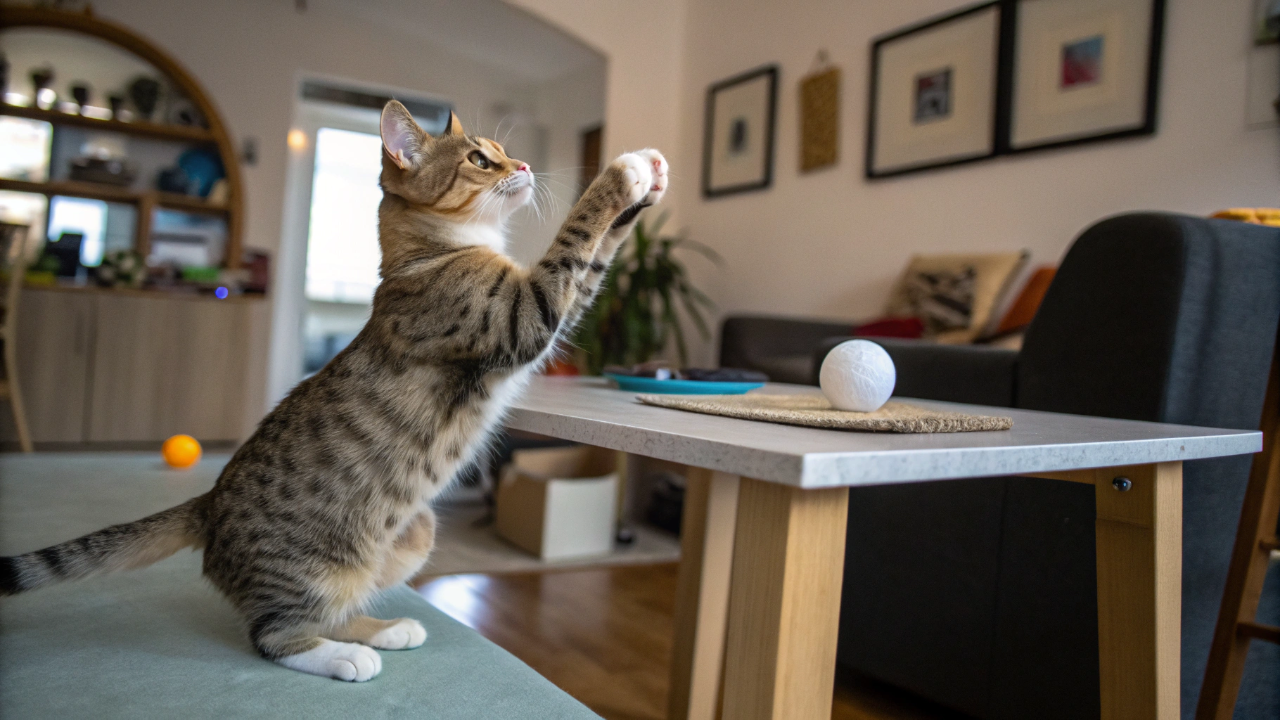 Brinquedos interativos, prateleiras próprias para gatos e rotinas de brincadeira ajudam bastante. Assim, o gato gasta energia de forma saudável e perde o interesse em empurrar tudo da mesa.