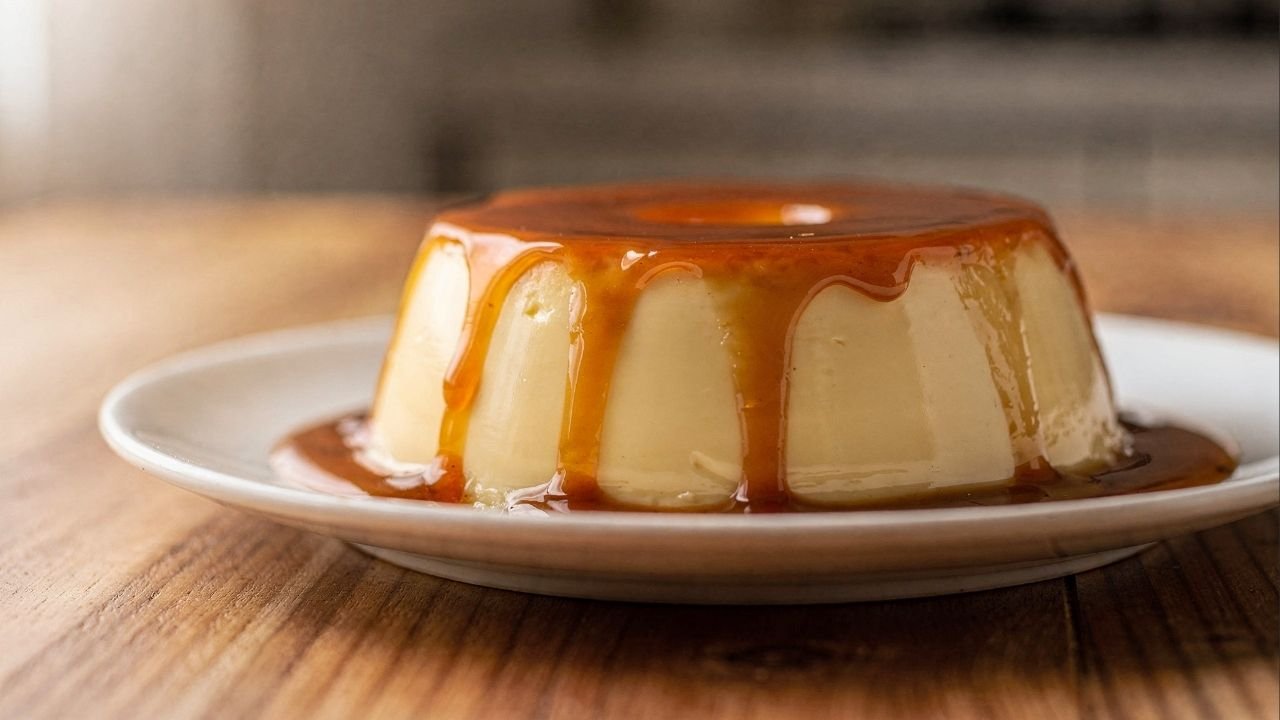 Antes de desenformar, aquecer rapidamente o fundo da forma dissolve o caramelo e permite que o pudim saia inteiro, preservando a superfície lisa e brilhante.