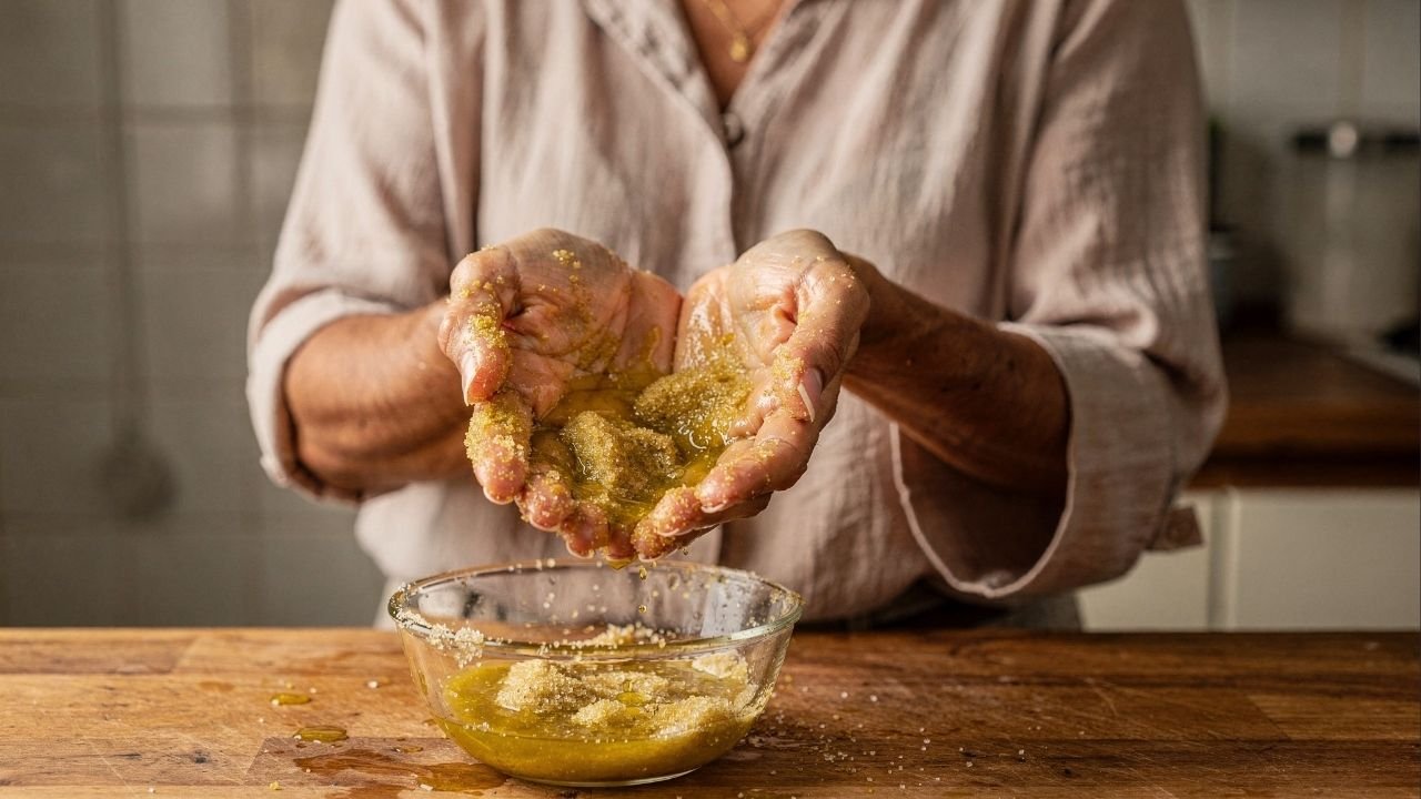 A esfoliação com açúcar e azeite remove células mortas e repõe lipídios da pele. A técnica restaura a barreira cutânea das mãos, suaviza cutículas e devolve maciez imediata quando aplicada uma a duas vezes por semana.