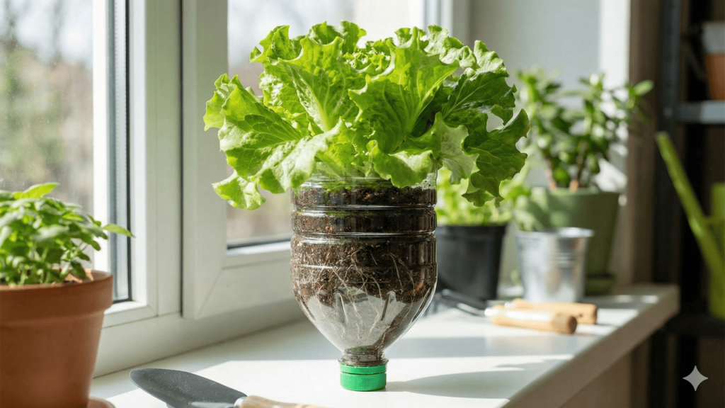 Os cuidados com a alface em garrafa PET envolvem principalmente rega