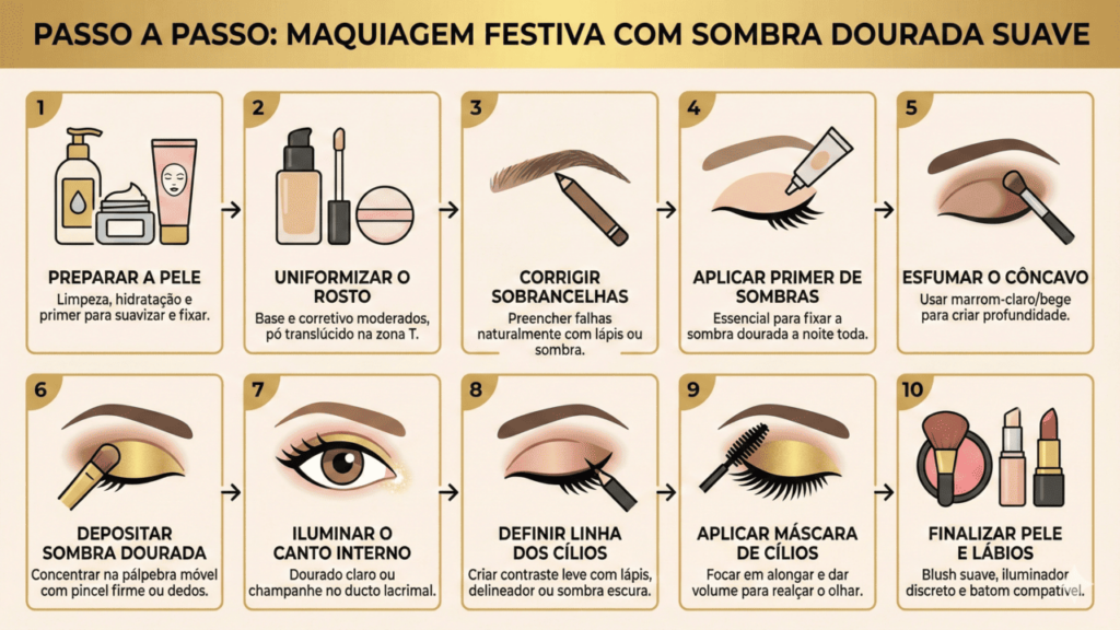 Para que a maquiagem dourada para eventos noturnos tenha boa duração e acabamento, alguns passos básicos ajudam a organizar o processo. Abaixo, uma sequência simples que costuma ser seguida por maquiadores em produções de festa, incluindo adaptações para diferentes tipos de pele.