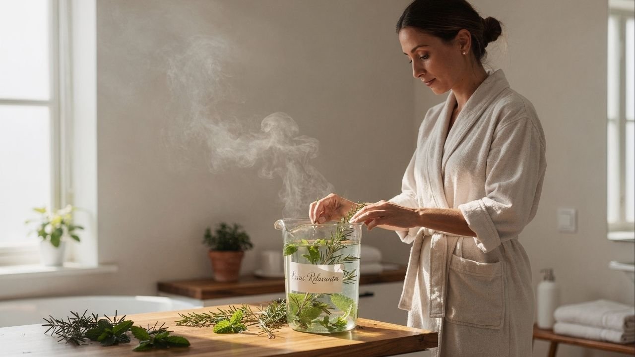 O banho de alecrim e hortelã estimula circulação e relaxamento muscular por óleos essenciais. A infusão correta libera compostos aromáticos que aliviam tensões, melhoram fluxo sanguíneo e promovem sensação de leveza corporal.