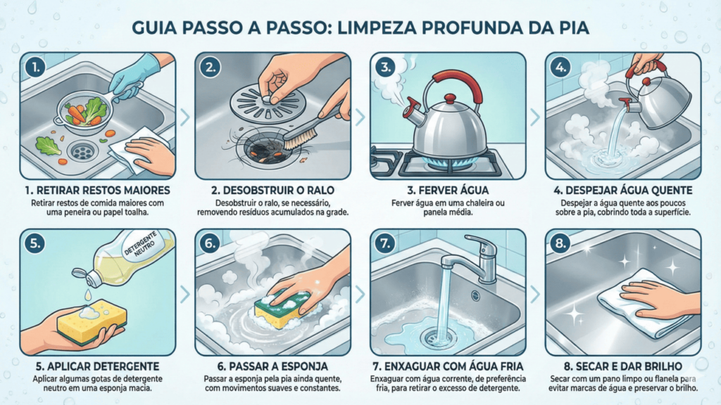 - Limpeza leve diária: enxaguar a pia após o uso, passar uma esponja com detergente e secar com pano limpo.