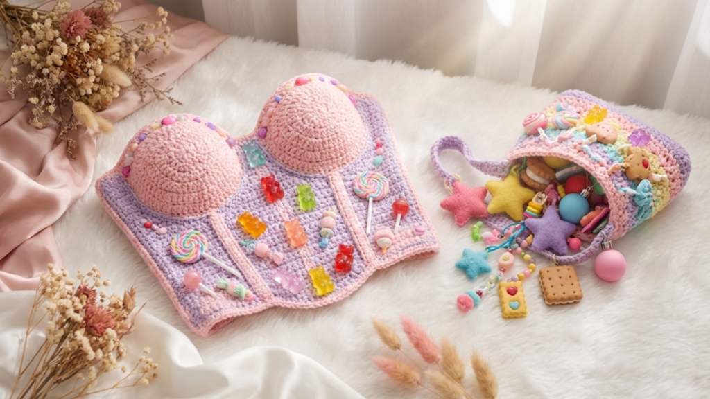 Essa estética se inspira em doces, guloseimas e no universo infantil para criar looks fofos. O uso de cores pastéis, como rosa e lilás, aparece em corsets e tops que lembram pirulitos gigantes.