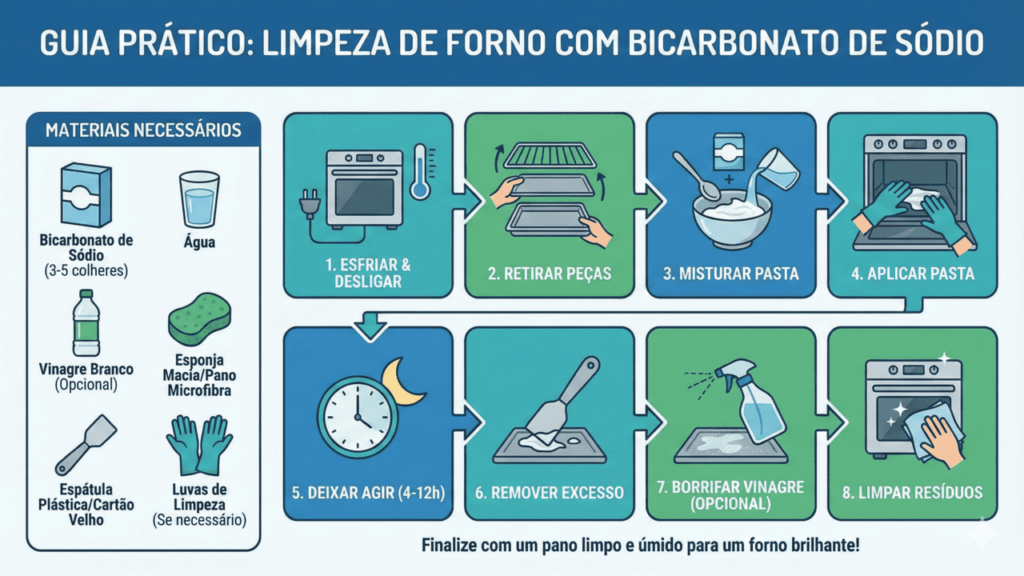Para que o bicarbonato funcione bem, vale seguir uma sequência simples, usando itens que quase todo mundo já tem em casa. Assim, o forno ganha aparência mais limpa, cheiros diminuem e você evita aquele esfrega-esfrega cansativo.