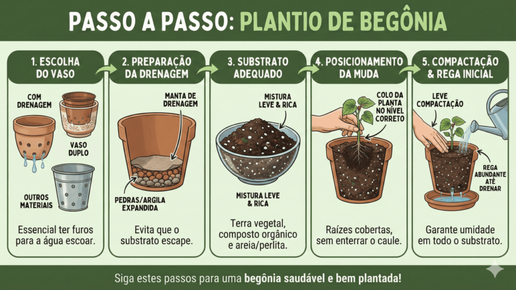 Para que o plantio de begônias em vasos decorativos funcione bem, vale seguir um passo a passo simples desde o começo. Uma boa preparação do vaso e do substrato ajuda a prevenir problemas como murcha prematura, raízes podres e folhas amareladas logo após o plantio.
