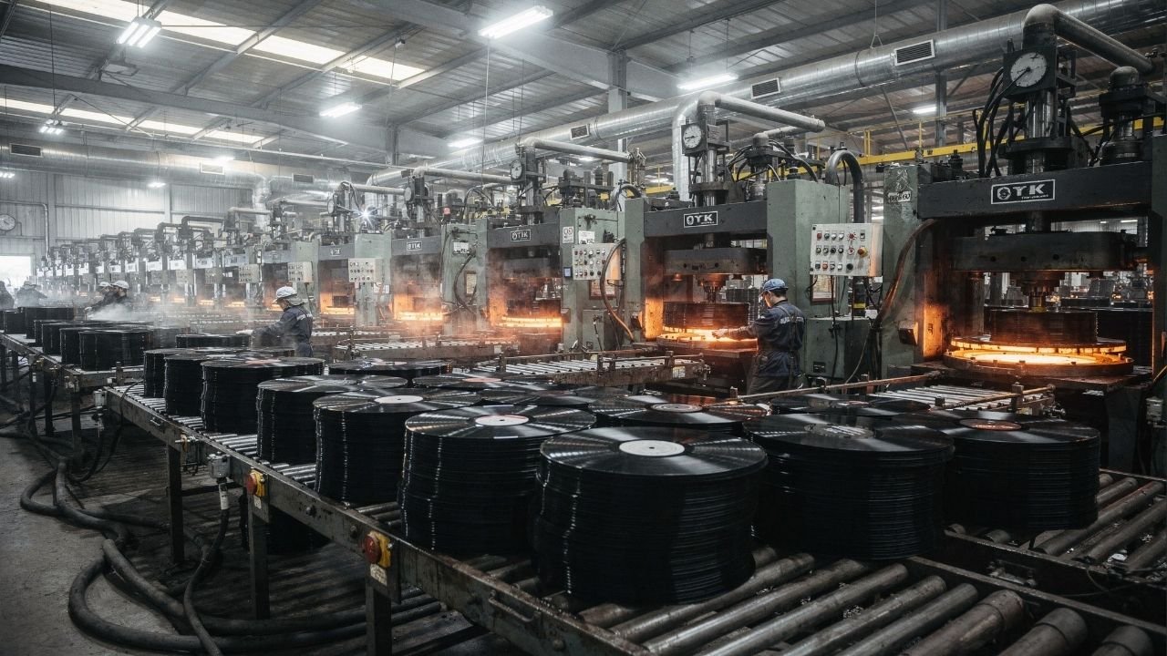 A produção combina métodos clássicos e sistemas recentes de prensagem de vinil. O fluxo técnico envolve gravação metálica precisa e moldagem sob calor e pressão, garantindo padrão sonoro elevado e repetibilidade industrial, como nas etapas a seguir.