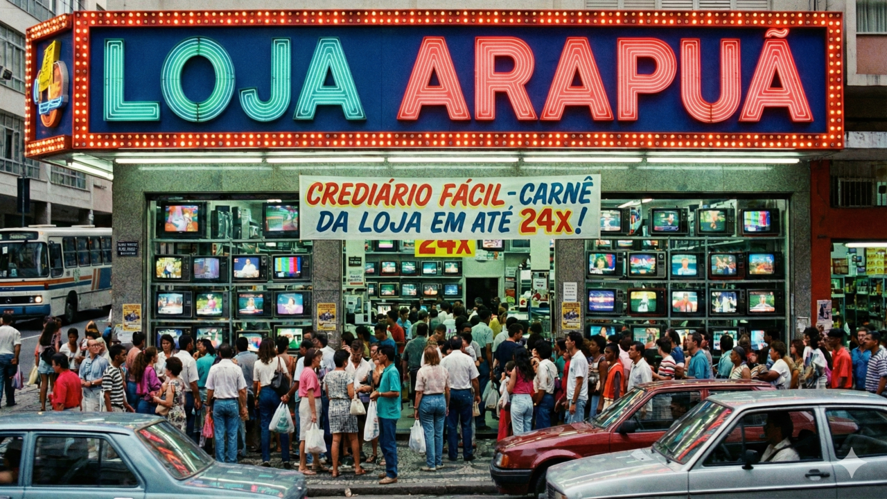 Luzes em neon, vitrines cheias de TV ligada e um jingle que gruda na cabeça fazem da história da Arapuã um dos capítulos mais marcantes do varejo brasileiro: a rede que virou a maior loja de eletro do país cresceu acelerada no crediário, surfou a euforia do consumo popular e acabou afogada em dívidas bilionárias, deixando lembranças, processos na Justiça e muitas lições para o presente.