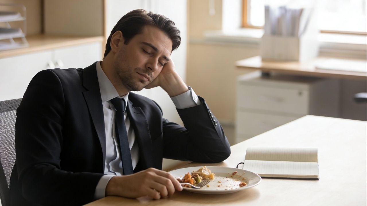 • Trabalho sedentário prolongado que amplia fadiga mental pós-prandial