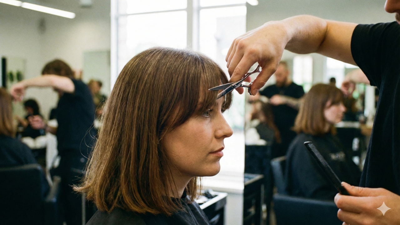 A franja é um dos elementos que mais transformam os cortes de cabelo de comprimento médio e pode corrigir visualmente proporções do rosto. Em rostos alongados, franjas retas ou ligeiramente arredondadas encurtam a face; em rostos redondos, franjas laterais mais longas criam linhas diagonais que afinam a região das bochechas.