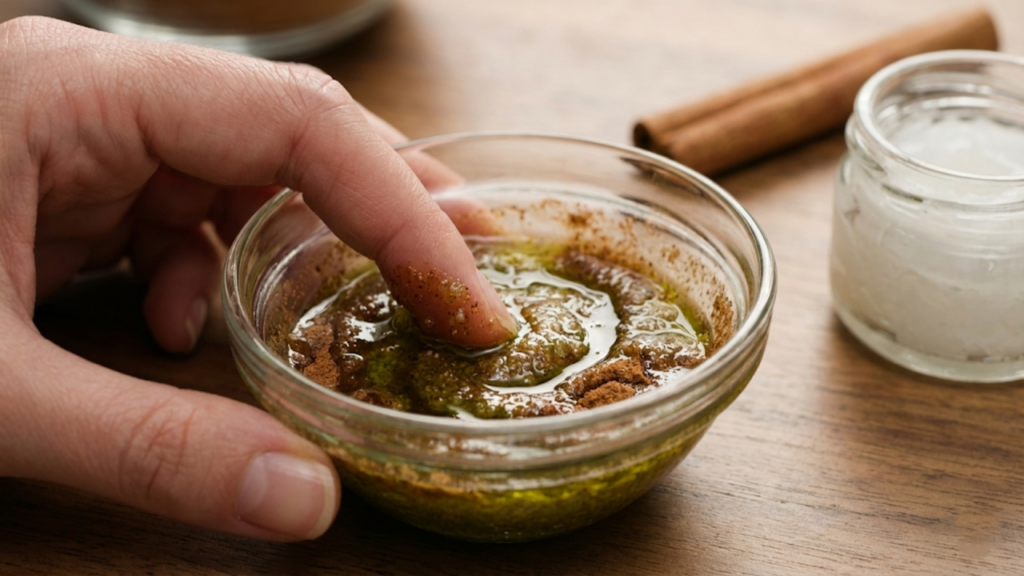 O primeiro passo do tratamento exige uma limpeza profunda para retirar as células mortas e ativar a circulação da região. Você vai aplicar uma mistura caseira de azeite com canela em pó, fazendo movimentos circulares bem suaves sobre a boca por alguns segundos.