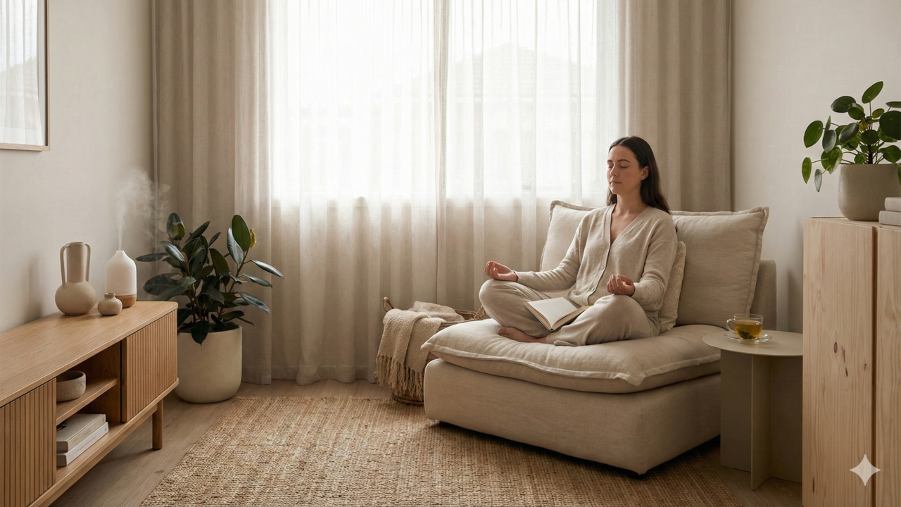 Montar uma sala de bem-estar em casa não exige reformas nem grandes gastos. Em muitos casos, basta reorganizar um cômodo existente ou reservar um canto da sala ou do quarto, priorizando um ambiente visualmente calmo, com poucos objetos e sensação de ordem.