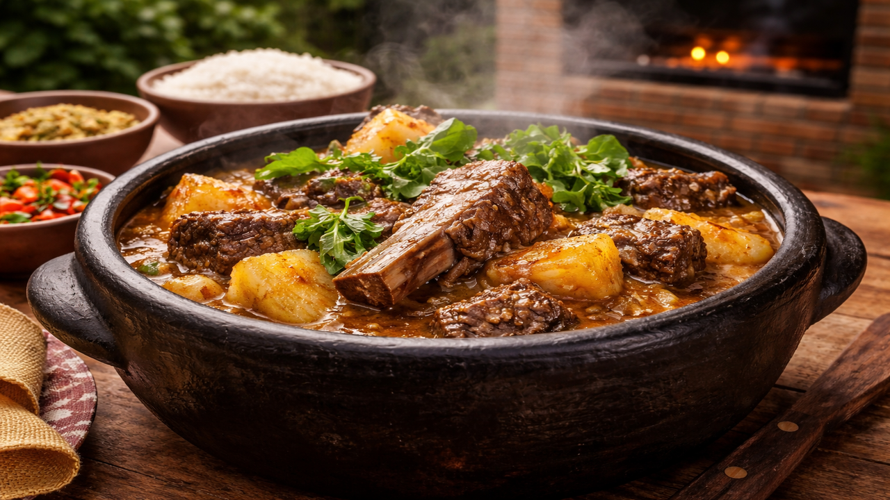 O resultado é um cozido robusto, com carne desmanchando, mandioca macia e um caldo espesso que acompanha muito bem arroz, farofa e pães rústicos. Serve cerca de seis pessoas e une clima de churrasco com cara de comida de fogão a lenha.