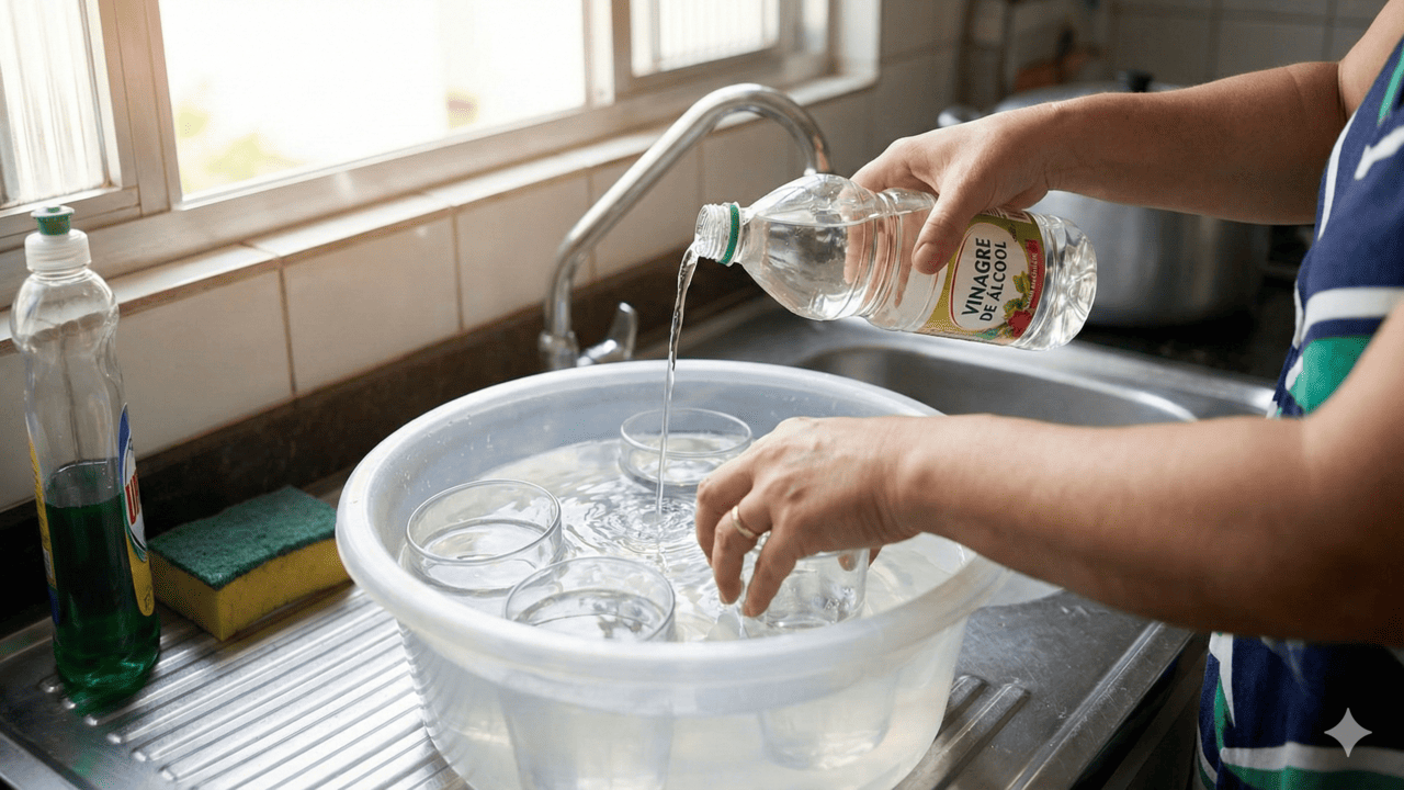 Para incluir o vinagre branco na rotina sem complicação, você pode usá-lo como um passo extra de enxágue. Isso ajuda tanto a tirar o cheiro de ovo quanto a deixar o vidro mais transparente e com menos manchas depois de seco, contribuindo para uma limpeza mais profissional em cozinhas domésticas e comerciais.