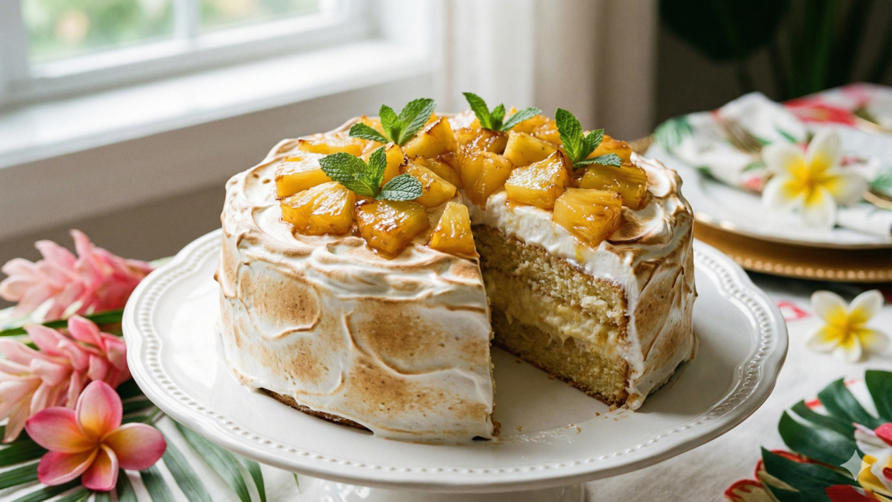 Depois de pronta a massa, a calda e o creme, a montagem é simples: o bolo já frio é cortado ao meio, cada parte é umedecida com a calda de hortelã, o creme de coco com abacaxi é espalhado sobre a base e a outra metade da massa fecha o bolo. Por cima, entra um merengue feito só com claras e açúcar demerara, batidos até picos firmes, finalizado com pedaços de abacaxi e folhas de hortelã.