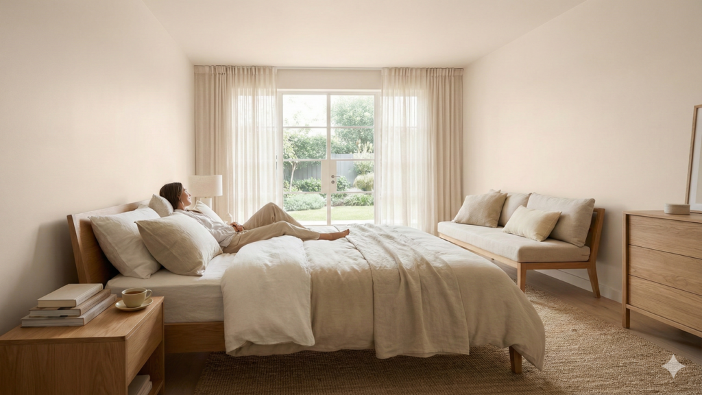 - Em quartos: paredes em Cloud Dancer com roupa de cama em tons areia ou verde suave.