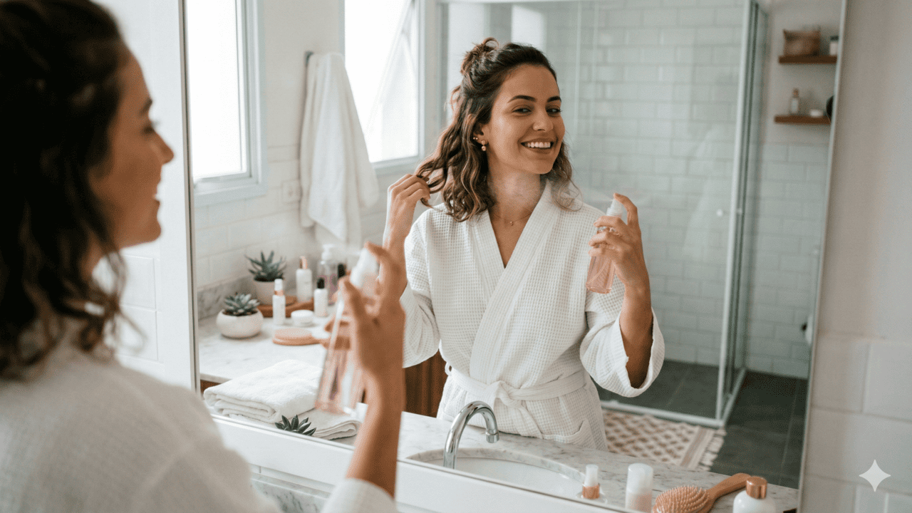 No cabelo, o ideal é aplicar com moderação: borrife no ar e passe rapidamente pelos fios, sem focar no couro cabeludo, já que o álcool pode ressecar. Essa técnica cria aquele cheirinho gostoso que aparece quando o cabelo balança ou quando você prende e solta os fios ao longo do dia.