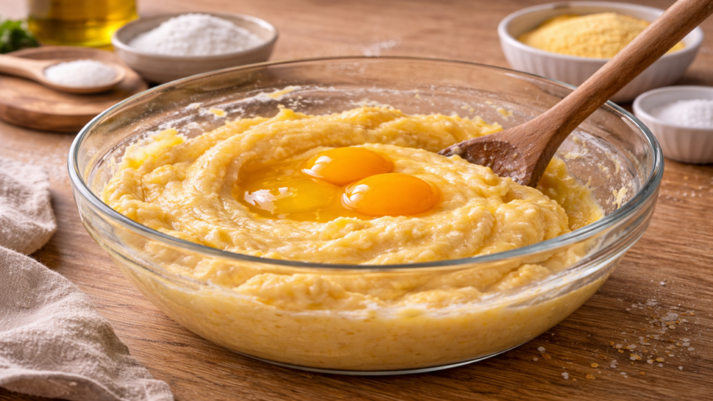 Depois disso, os ovos são adicionados um a um, até a massa ficar lisa, amarelada, macia e firme o bastante para ser modelada. Na sequência, ela é colocada em manga de confeiteiro ou saco plástico resistente, pronta para ser porcionada diretamente na assadeira.