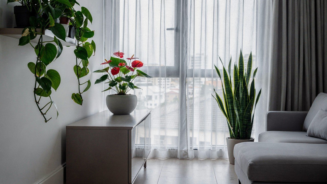 - Antúrio: perfeito para mesas e aparadores próximos a janelas com luz difusa. Suas flores duram meses e contribuem para manter o ambiente levemente mais úmido.