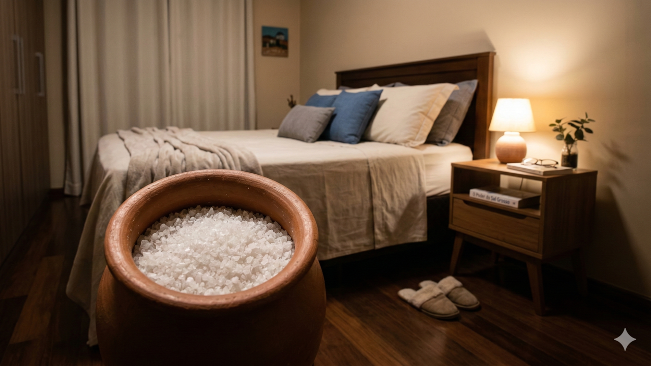 Colocar um frasco com sal grosso ao lado da cama é entendido como um gesto de cuidado com o campo energético do dormitório. Acredita-se que, enquanto o corpo e a mente descansam, o sal “segura” o que é pesado, favorecendo um sono mais equilibrado, sem substituir hábitos saudáveis de rotina noturna.