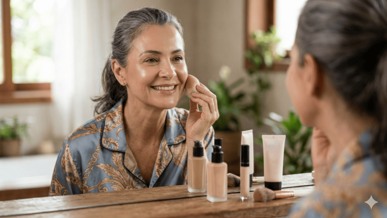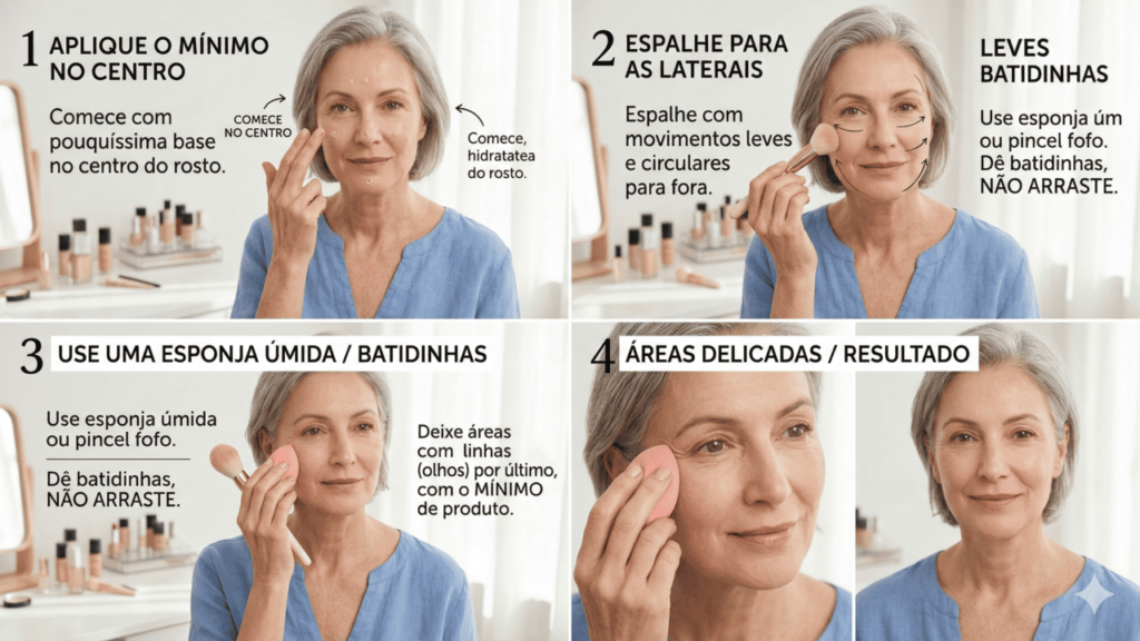 Para pele madura, base leve ou média, fluida e com acabamento luminoso ou semi-matte costuma funcionar melhor. Aquela base super grossa, de altíssima cobertura e totalmente seca, geralmente marca muito mais as rugas.