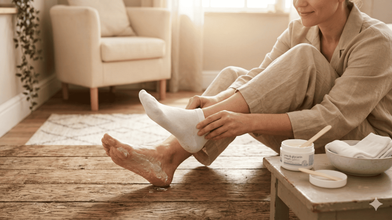 A meia de algodão é a grande parceira da técnica de pé de seda, porque ajuda a manter o creme em contato com a pele por mais tempo, sem abafar demais. O tecido de algodão costuma ser mais confortável, permite certa ventilação e cria uma oclusão leve, que reduz a perda de água e favorece a ação dos ativos hidratantes.